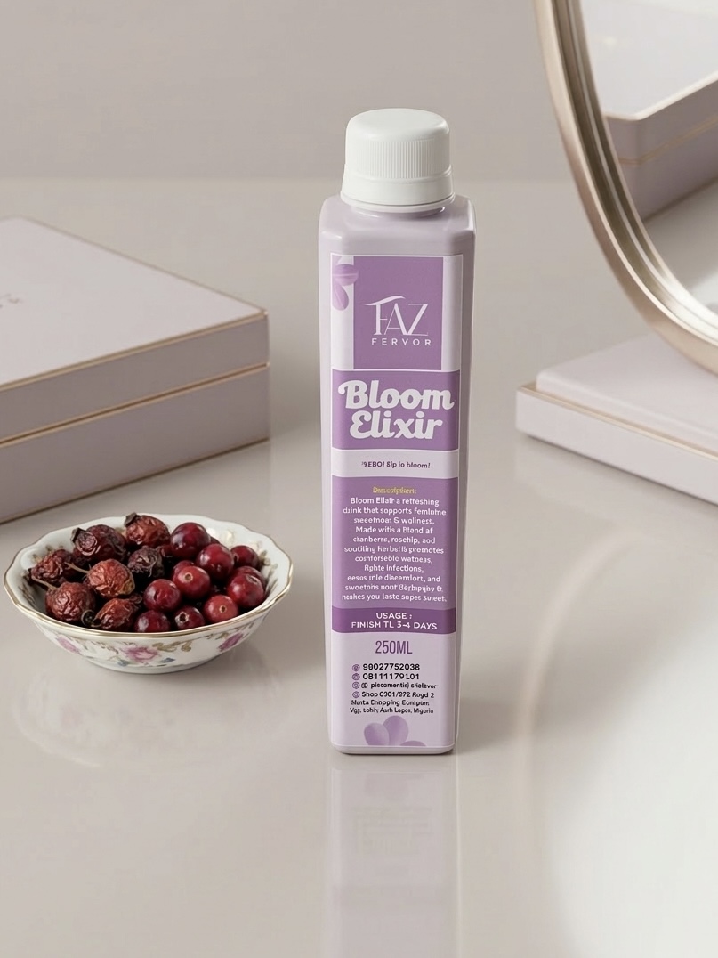 Description: Bloom Elixir a refreshing drink that supports feminine sweetness & wellness. Made With a blend of cranberry, rosehip, and soothing herbs, it promotes comfortable wetness, fights infections, eases pile discomfort, and sweetens your Va-Jay-Jay & makes you taste super sweet.